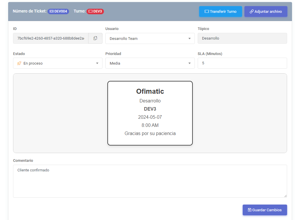 - Numero de Ticket: Este indica el numero del ticket con el cual se creo. Este numero es único y solo es visible por el agente en caso de que se este trabajando con la función de los turnos.