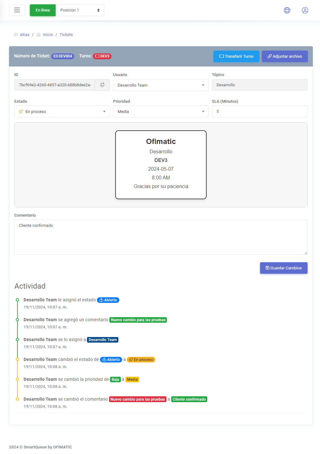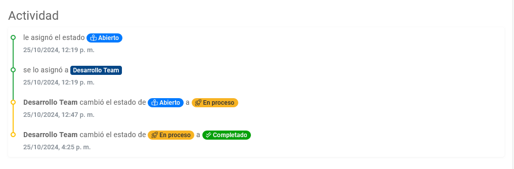 En este apartado se muestra la actividad del ticket, los cambios que ha ido sufriendo desde que este se crea hasta que se cierra.
